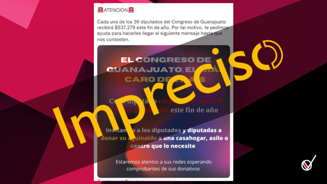 En Twitter circula una imagen que asegura que los 36 diputados del Congreso de Guanajuato reciben medio millón de pesos por el fin del año siendo el poder legislativo «más caro del país», sin embargo la información es imprecisa y aquí te explicamos porqué.