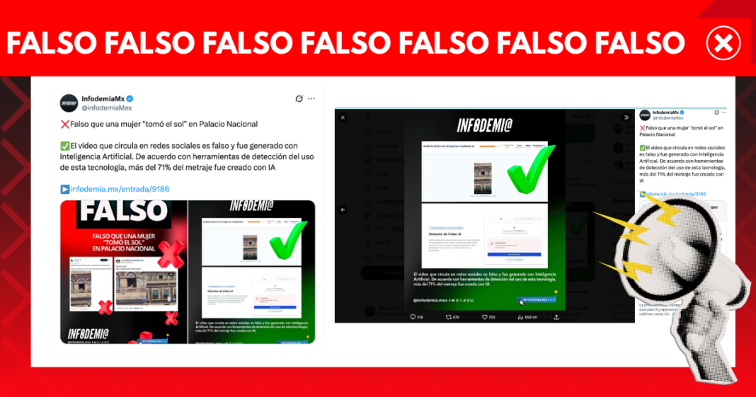 Tras la viralización, la plataforma del Gobierno Federal con la que se pretende combatir la información falsa, Infodemia desinformó al decir que el video estaba hecho sintéticamente. Infodemia aseguró que al pasar el video por plataformas de detección de IA se encontró manipulación digital.