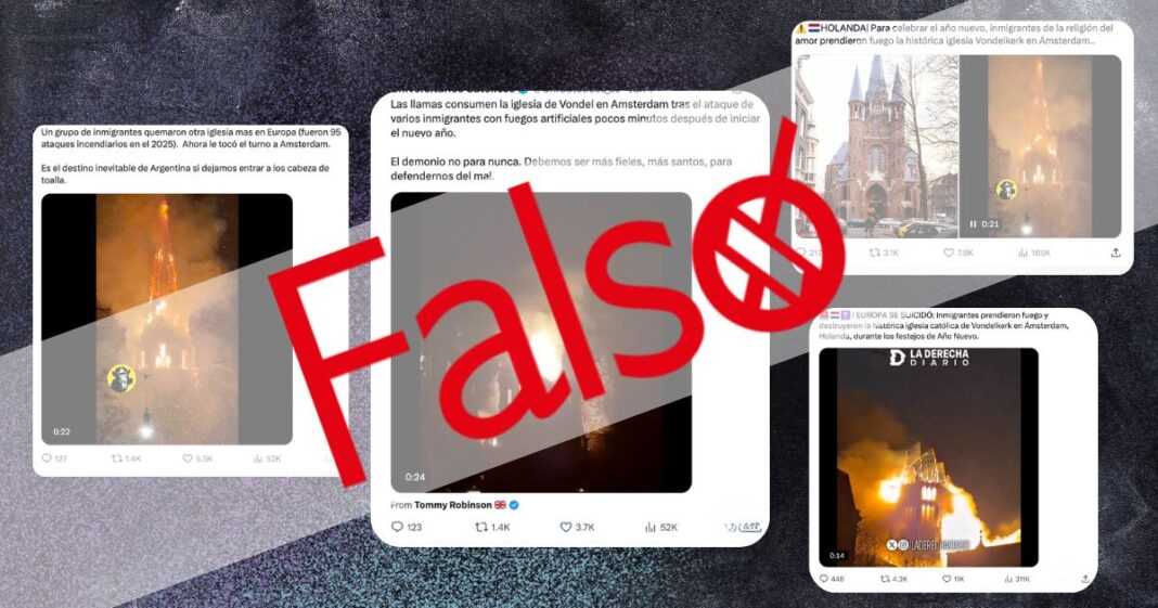 Pese a ello, publicaciones en X (antes Twitter) muestran imágenes de la iglesia en llamas, acompañadas de descripciones como: «Inmigrantes prendieron fuego y destruyeron la histórica iglesia católica de Vondelkerk en Ámsterdam, Holanda, durante los festejos de Año Nuevo”, con las que superaron hasta 10 mil «me gusta» y más de 300 mil visualizaciones.