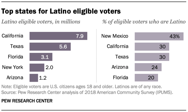 Grandes cantidades de votantes elegibles (electorado) latinos se concentran en estados que no son de batalla. De acuerdo con este mismo centro, California, el 30.5% del electorado son hispanos; en Nuevo México, el 42.6%.