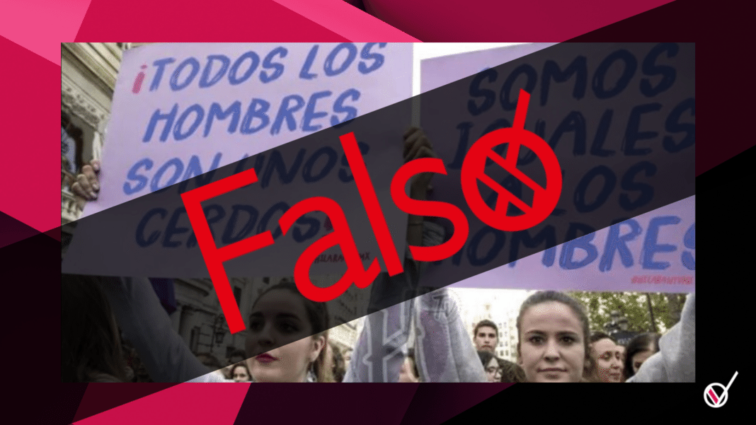 En Twitter se volvió viral una publicación en la que aparecen dos mujeres con un cartel cada una en los que supuestamente dicen que “todos los hombres son unos cerdos” y “somos iguales a los hombres”, sin embargo esto es falso, pues se trata de una fotografía manipulada.