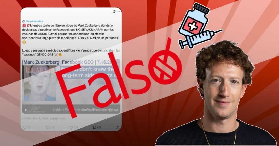 “Se filtró un video de Mark Zuckerberg donde le decía a sus ejecutivos de Facebook que NO SE VACUNARAN con las vacunas de ARNm (Covid) porque ‘no conocemos los efectos secundarios a largo plazo de modificar el ADN y el ARN de las persona’”, se lee en la publicación de X que superó 3 mil 100 “me gusta” y las 216 mil reproducciones desde el 8 de diciembre.