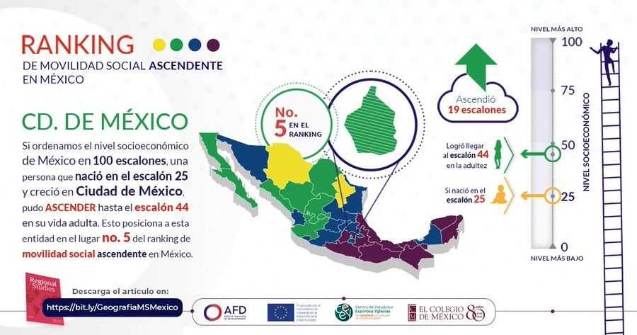 La marcada diferencia entre los estados de la república señalada anteriormente queda de manifiesto en un trabajo en el que presentamos un mapa sobre la geografía de la movilidad social en México En un extremo se encuentra Nuevo León, en donde una persona que nace en el escalón 25 de 100 en cuanto a sus recursos familiares de origen logra alcanzar, en promedio, el peldaño 46. En cambio, en Chiapas, una persona que parte de la misma situación pierde posiciones y cae al peldaño 21.