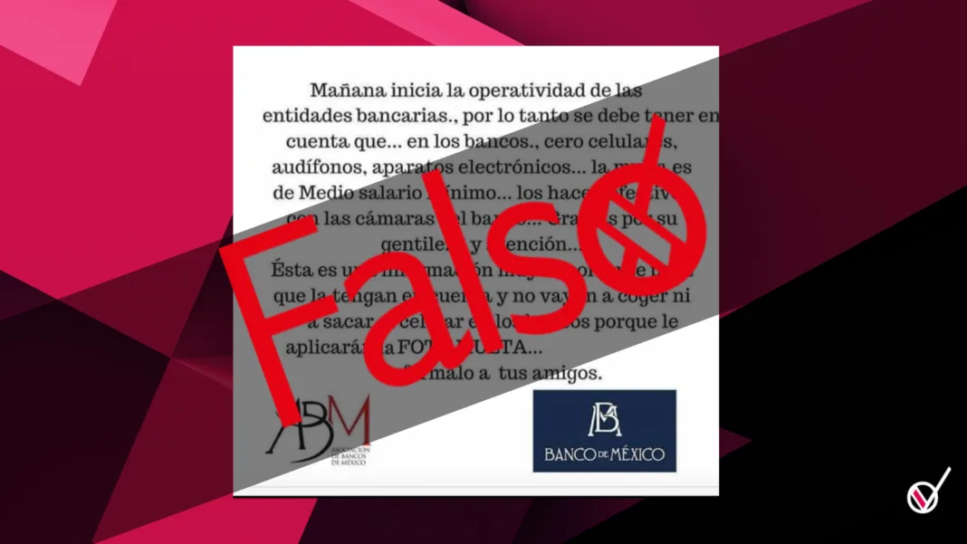 El texto que circula en grupos de WhatsApp advierte sobre el cambio de operación de los bancos en donde por medio de las cámaras en las instalaciones se penalizará a las personas que utilicen celulares, audífonos y otros dispositivos electrónicos recibiendo una multa equivalente a medio salario mínimo, la imagen agrega los logotipos del Banco de México y de la Asociación de Bancos de México.