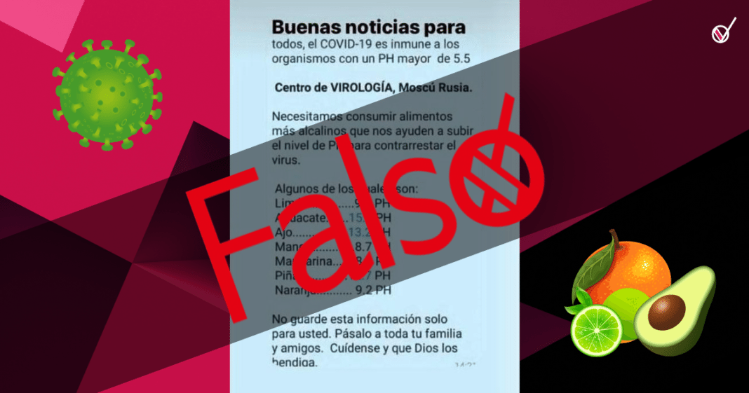 “El Covid-19 es inmune a los organismos con un pH mayor de 5.5 (…) Necesitamos consumir alimentos más alcalinos que nos ayuden a subir el nivel de pH para contrarrestar el virus”, se lee en el mensaje reenviado múltiples veces en WhatsApp.