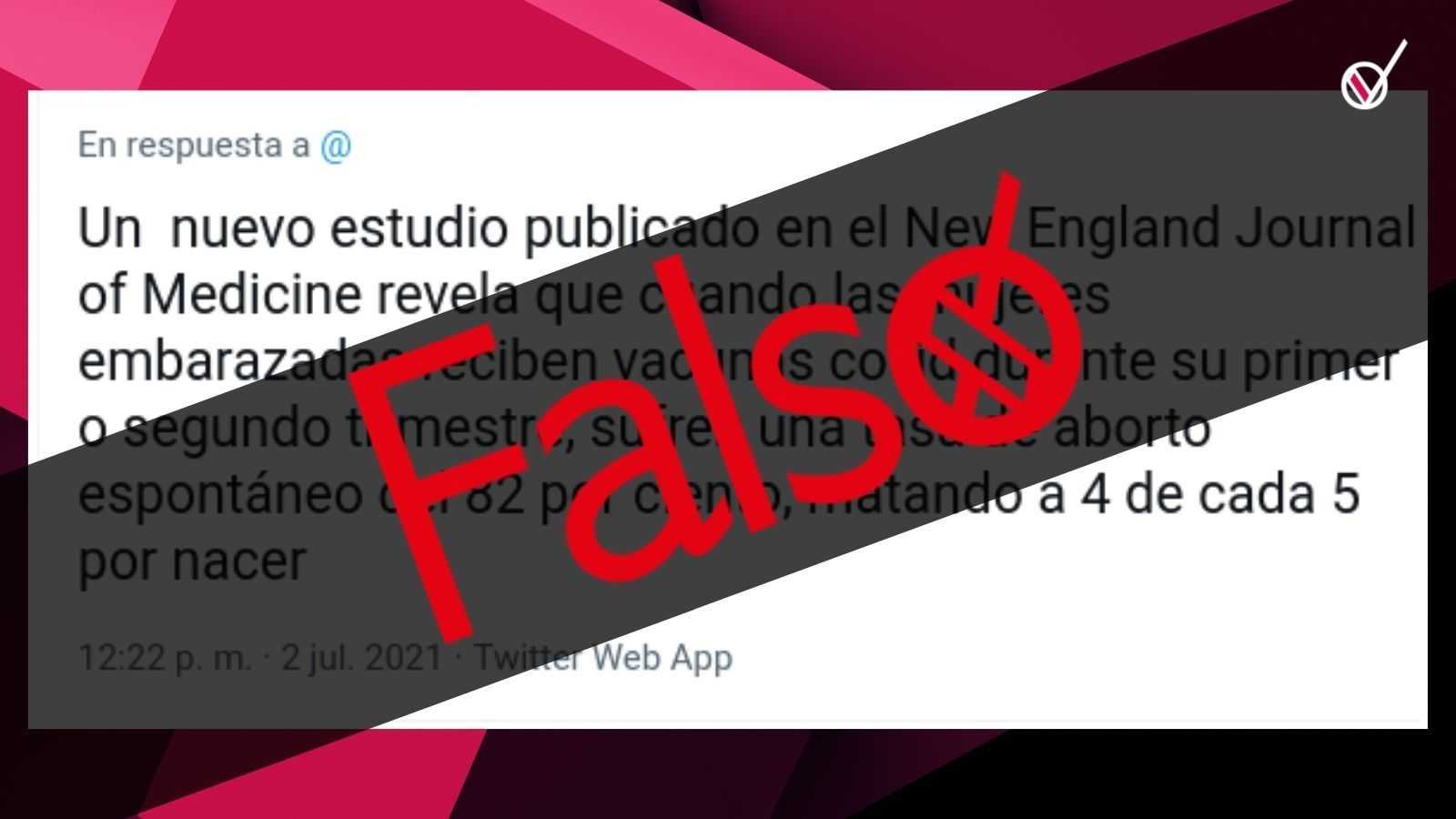 Esta afirmación es FALSA. En el mensaje se hace una interpretación errónea de los resultados preliminares de una investigación, publicada el pasado 17 de junio en la revista científica The New England Journal of Medicine (NEJM). En ella se observó que las embarazadas que habían recibido las vacunas contra la COVID-19 de Pfizer-BioNTech y Moderna tenían una tasa de abortos espontáneos de cerca del 12%, el cual es similar a la de las no vacunadas.