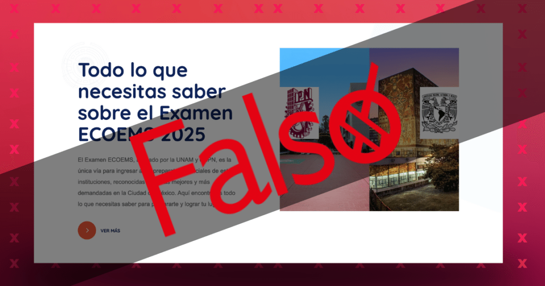 Mediante nuestra cuenta de X, recibimos una alerta sobre el dominio ecoems.org, una página que desinforma sobre un supuesto examen ECOEMS que dice sustituirá al examen de ingreso Comipems para ingresar a los bachilleratos de la Universidad Nacional Autónoma de México (UNAM) y el Instituto Politécnico Nacional (IPN).
