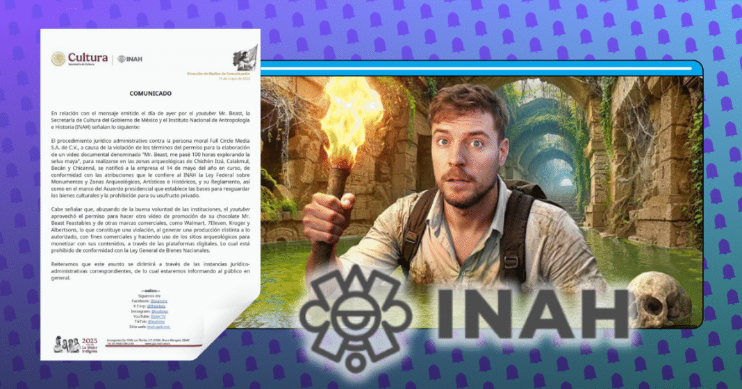 El Instituto Nacional de Antropología e Historia (INAH) comenzó un procedimiento jurídico administrativo contra Full Circle Media S.A. de C.V., empresa representante del youtuber Mr. Beast por incumplir los permisos de grabación en zonas arqueológicas de México, luego del debate generado en redes sociales.