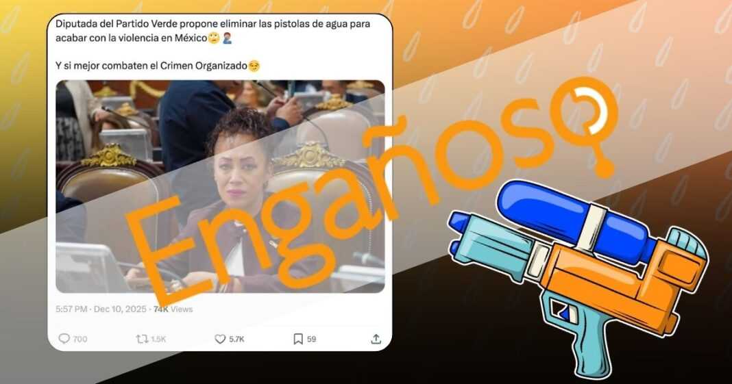 “Diputada del Partido Verde propone eliminar las pistolas de agua para acabar con la violencia en México”, señala una publicación de X que obtuvo 5 mil 700 “me gusta” y más de 74 mil visualizaciones. Aunque afirmaciones similares circularon en otras plataformas como Facebook y Threads.