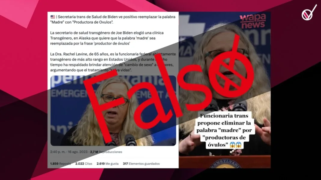 Medios de comunicación y usuarios de redes sociales difundieron la noticia de que la Subsecretaria de Salud de los Estados Unidos, Rachel Levine supuestamente propuso reemplazar la palabra «madre» con «productora de óvulos» durante una visita del 6 de agosto de 2023 a la única clínica LGBTIQ+ en Alaska.