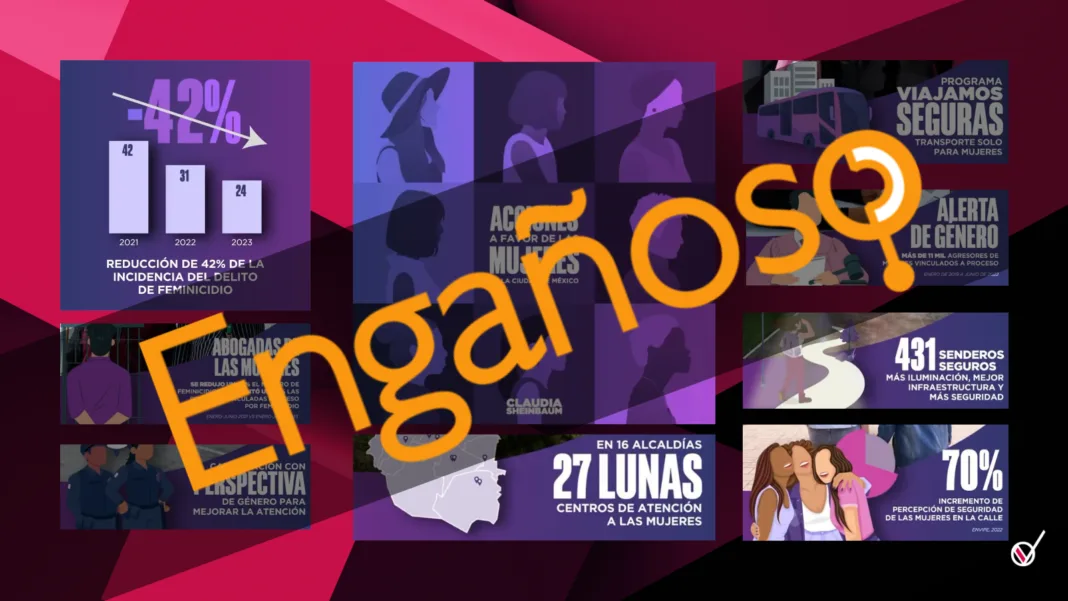 Las infografías de Sheinbaum presentan datos imprecisos o engañosos sobre la violencia de género en la Ciudad de México, aunque algunas cifras son ciertas, otras consideran periodos incorrectos, fuera de contexto, o bien, algunas acciones no se pueden cuantificar sus resultados.