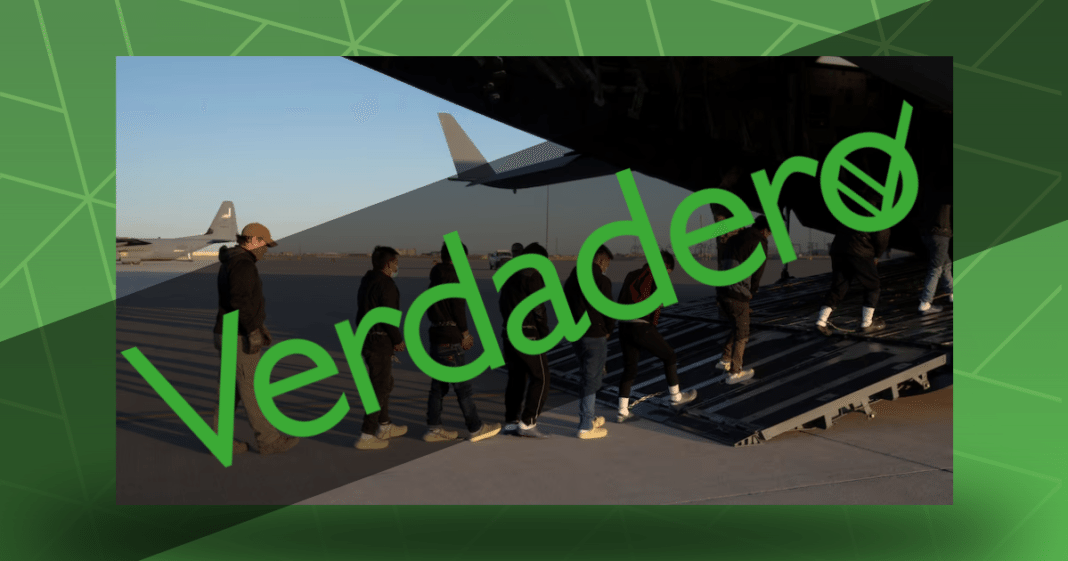 En redes sociales, circulan imágenes de personas migrantes deportadas subiendo a aviones pertenecientes al gobierno de Estados Unidos para arribar a su lugar de origen encadenadas de manos y pies, esta noticia es real, pero se han viralizado imágenes creadas con inteligencia artificial.