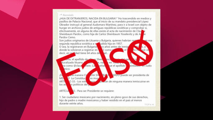 En WhatsApp, circula la noticia de que la ex jefa de gobierno, Claudia Sheinbaum nació en Bulgaria y por ello, no puede ser candidata a la presidencia...
