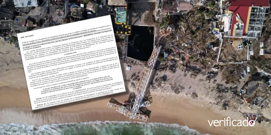 A través del Diario Oficial de la Federación (DOF) se dio a conocer que «se da por concluida la Declaratoria de Emergencia (Acuerdo por el que se Establece el Término de Situación de Emergencia) por la ocurrencia de lluvia severa y vientos fuertes el día 24 de octubre de 2023, en los municipios de Acapulco de Juárez y Coyuca de Benítez del estado de Guerrero».