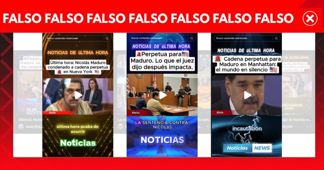 A inicios de mes, y con más de tres millones de visualizaciones en TikTok e Instagram, usuarios han viralizado un clip que detalla la supuesta sentencia a Nicolás Maduro. El video, diseñado como un reporte de noticias de “último minuto”, enumera una serie de delitos graves e incluye el texto sobrepuesto “Perpetua para Maduro. Lo que el juez dijo después impacta” (sic).