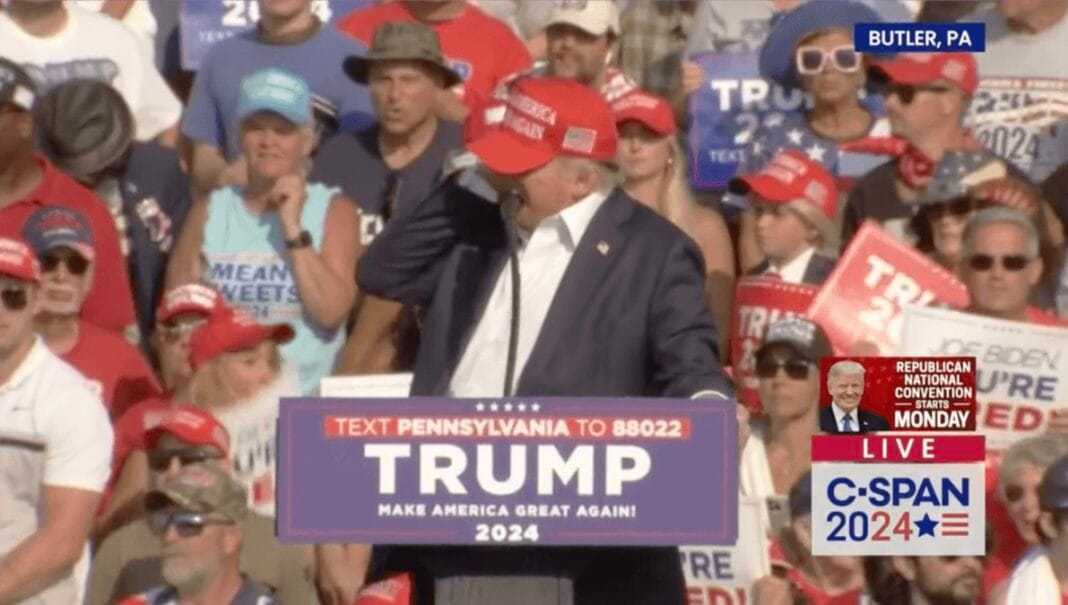 La fuente exacta de los ruidos no está clara aún, pero la cara, cerca de la oreja derecha de Trump estaba ensangrentada mientras era llevado rápidamente fuera del escenario, según se ve en las imágenes. Antes de ser escoltado fuera del escenario por el Servicio Secreto, Trump levantó el puño en un gesto hacia la multitud.