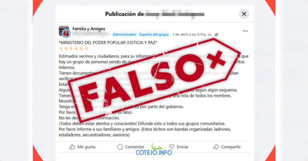 La unidad de verificación de Efecto Cocuyo desmintió una versión del mensaje viral que circulaba en WhatsApp. En el texto publicado el 25 de junio de 2024 se determinó que “es falso que se estén haciendo pasar por funcionarios del Ministerio del Interior y verificando identificación para un censo en Venezuela”.