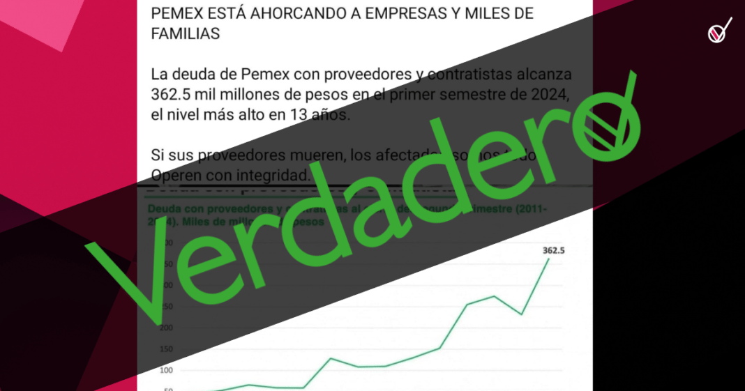 En redes sociales circula una imagen en la que se indican datos sobre la deuda de Pemex con contratistas y proveedores diciendo que está en su nivel más alto, esto es verdadero.