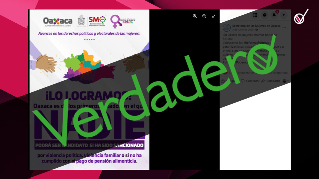 Entonces sí, es verdad que en Oaxaca, según la ley vigente, una persona no puede contender por un puesto de elección popular si ha sido sancionado por actos de violencia de género.