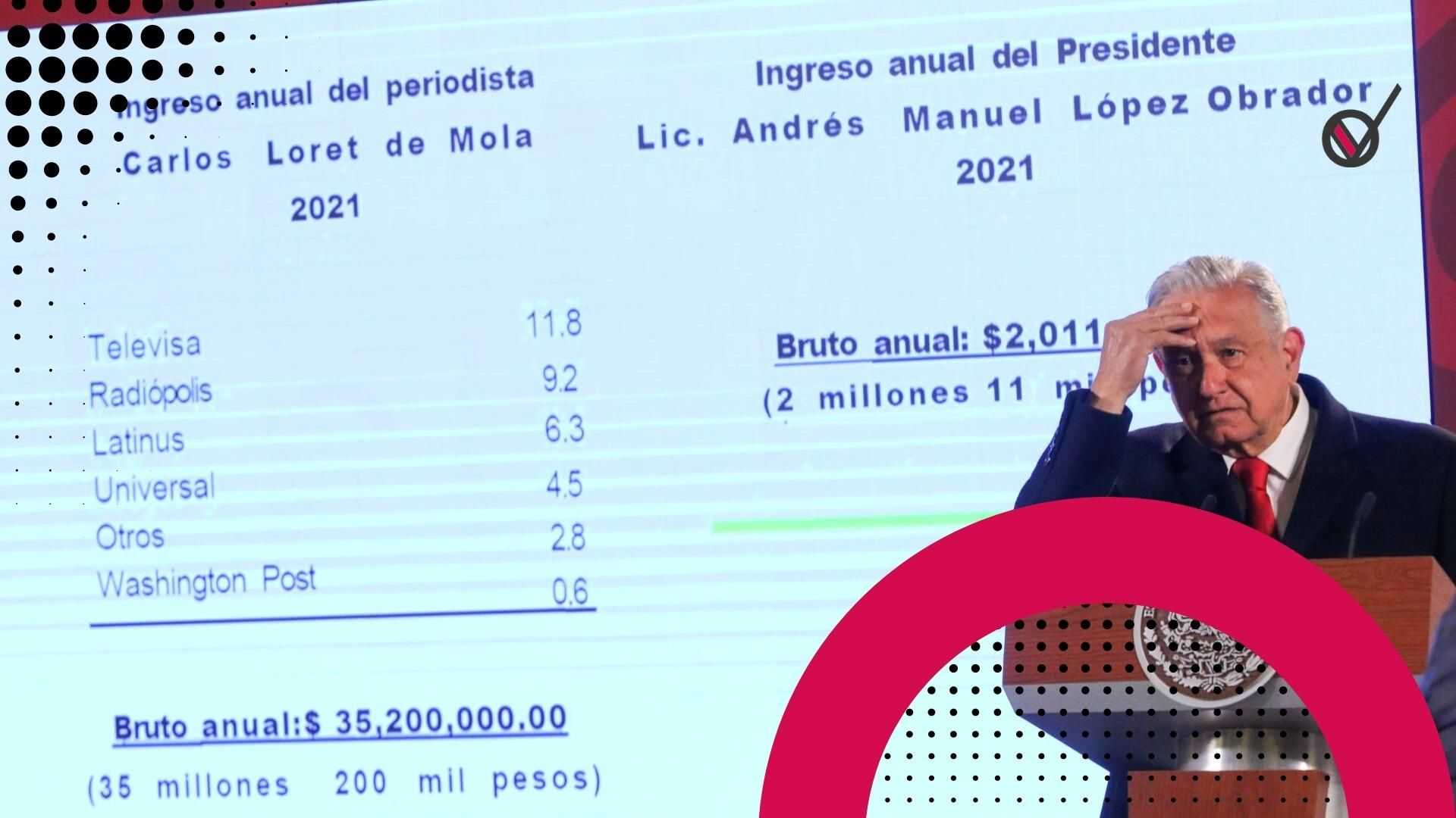 En la conferencia matutina del 11 de febrero de 2022 el presidente de México, Andrés Manuel López Obrador, exhibió los presuntos ingresos por 35.2 milones de pesos que el comunicador Carlos Loret de Mola obtuvo por su trabajo en Televisa (en 2019), Radiopolis, Latinus, El Universal, Washington Post y otros medios de comunicación.
