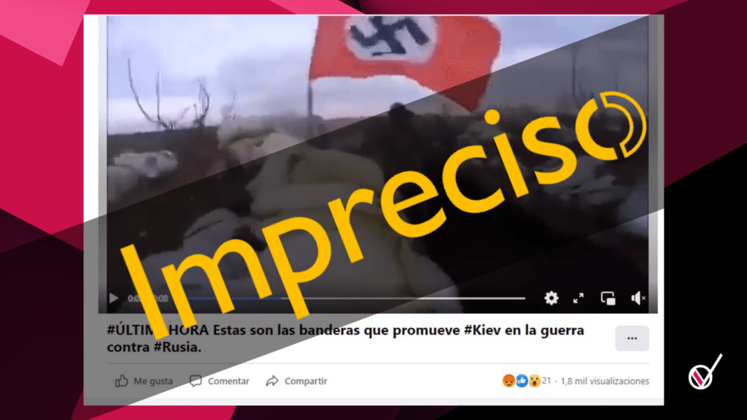 En Facebook circula un video que muestra una trinchera en una región ucraniana, donde se ve a soldados disparar junto a una bandera con la esvástica nazi.