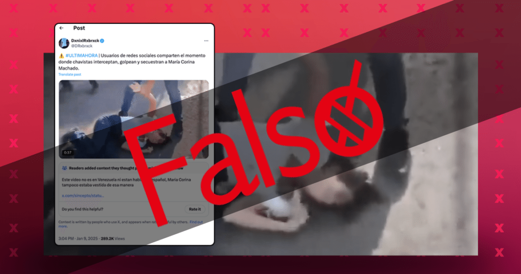 En X y Facebook publicaron un video de una mujer retenida y golpeada con el mensaje: “#ULTIMAHORA | Usuarios de redes sociales comparten el momento donde chavistas interceptan, golpean y secuestran a María Corina Machado”.